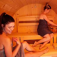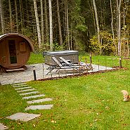 Von der Terrasse können Sie unter einer Markise dem kleinen Bachlauf lauschen. Im Außenbereich können Sie einen Whirlpool sowie die Fasssauna nutzen.